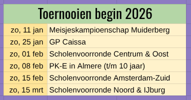 Indeling in categorieën naar speelsterkte en leeftijd. De tijdcontrole is 10m+5s. We spelen 6, 7 of 8 ronden. De prijsuitreiking is altijd rond 16:30.